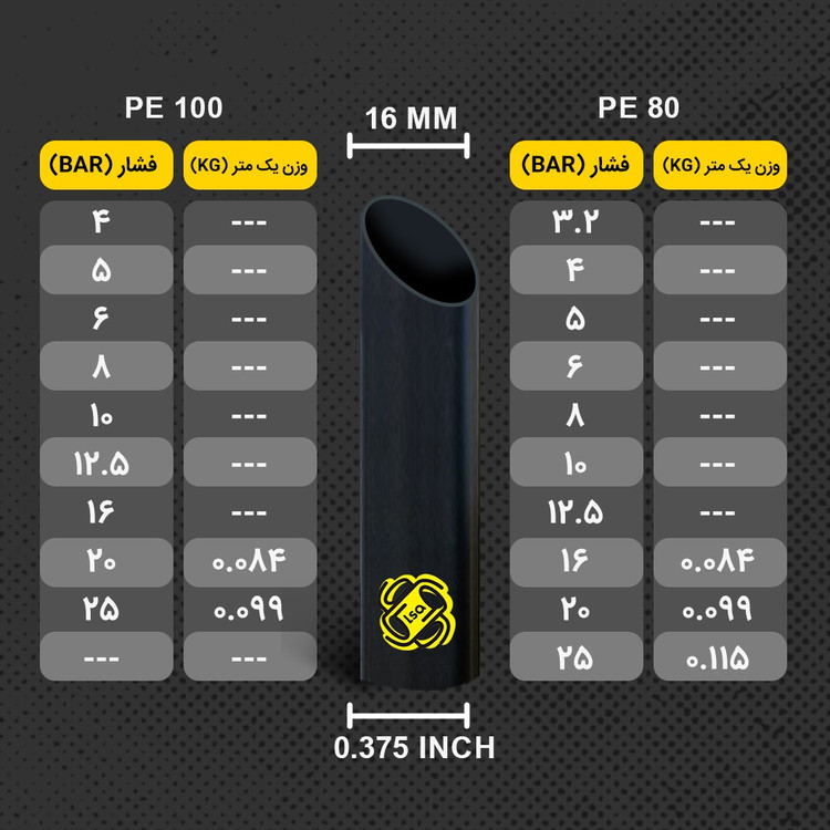 | PE100 | لوله سایز 16 | 16 | کلاف 400 متری |
