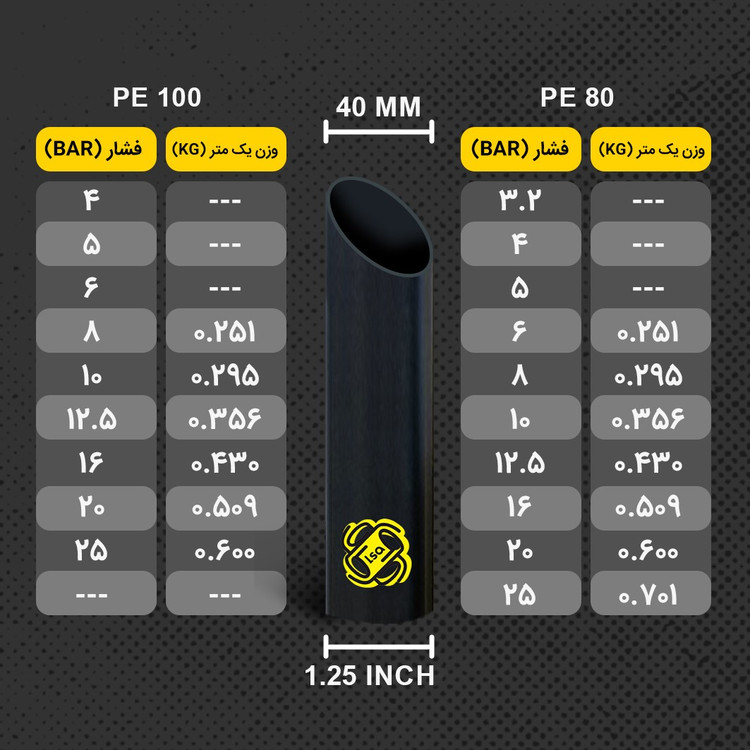 | PE100 | لوله سایز 40 | 8 | کلاف 100 متری |