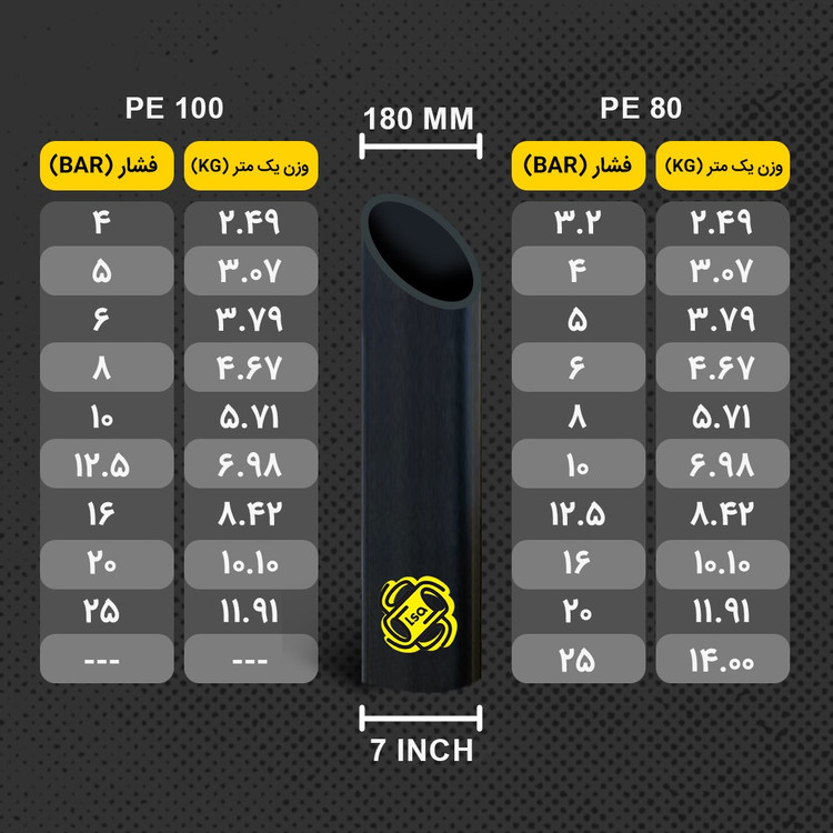 | PE80 | لوله سایز 180 | 3.2 | شاخه 12 متری |