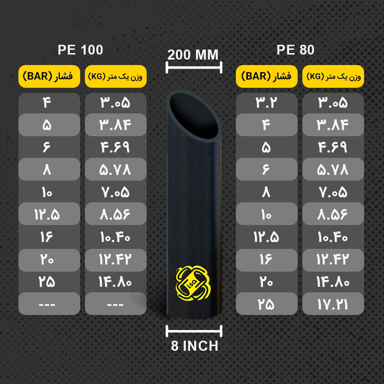 | PE80 | لوله سایز 200 | 3.2 | شاخه 12 متری |