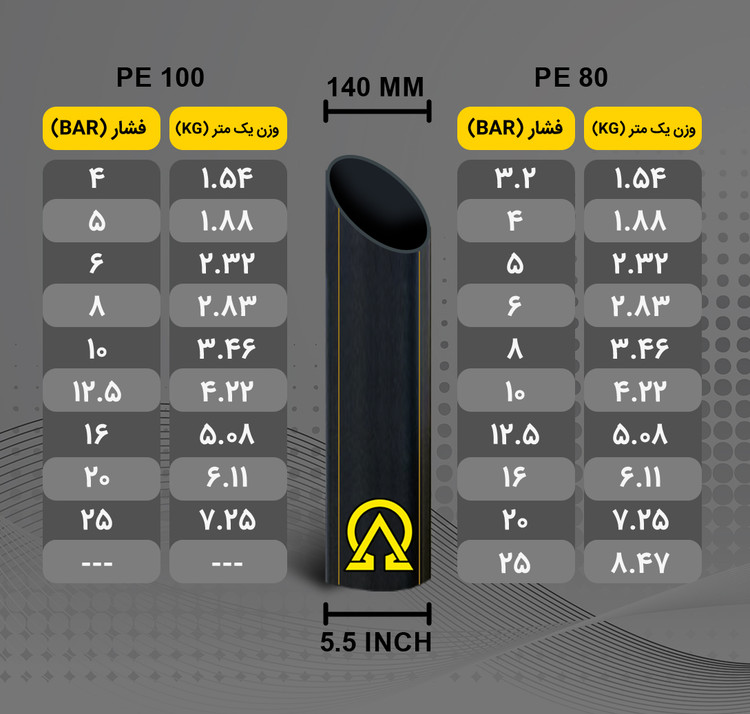 | PE80 | لوله سایز 140 | 3.2 | شاخه 12 متری |